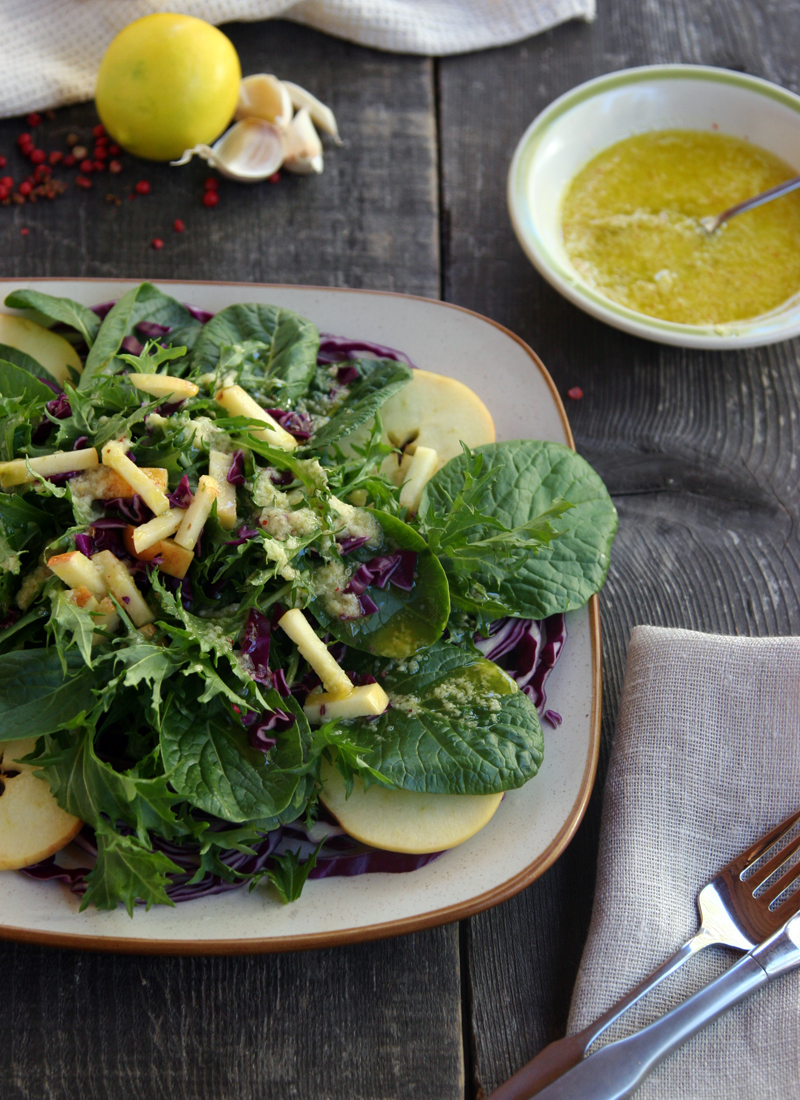 - To a small food processor add the juice of the lemon, the peeled garlic, the apple quarter, the ginger and the pink peppercorn. Mix well until it forms a creamy dressing.