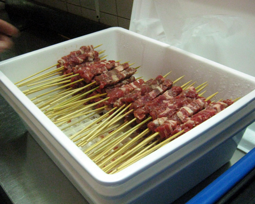 The meat is probably shoulder, or other second quality fatty parts. the fat is important, as it keeps the meat moist while grilling.